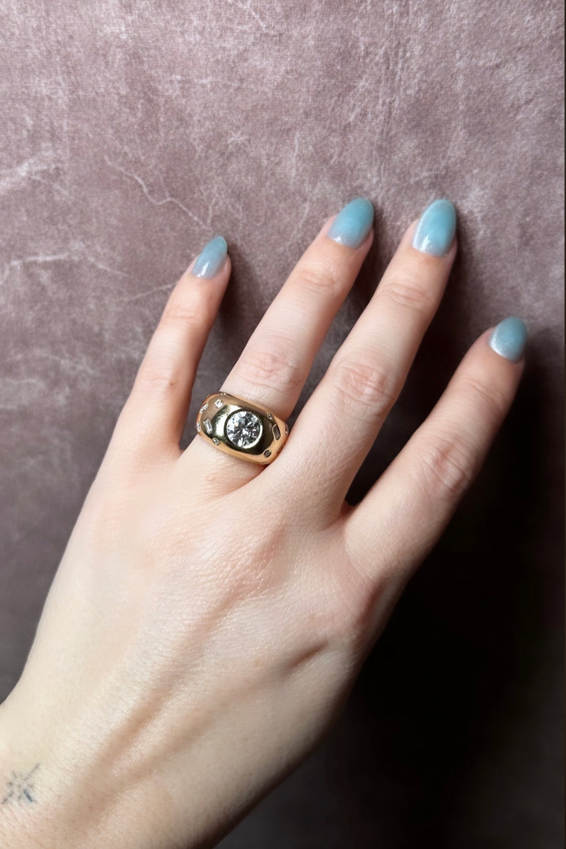 I loved working with my dear friend Katie Jane Hughes to remake her engagement ring into a bold and unique signet ring. She wanted something that didn't feel like a traditional ring. So we took the original center stone and placed it into a bold new setting. Then added different shaped stones and scattered them on the outside of the band to uplift and modernize the center stone.