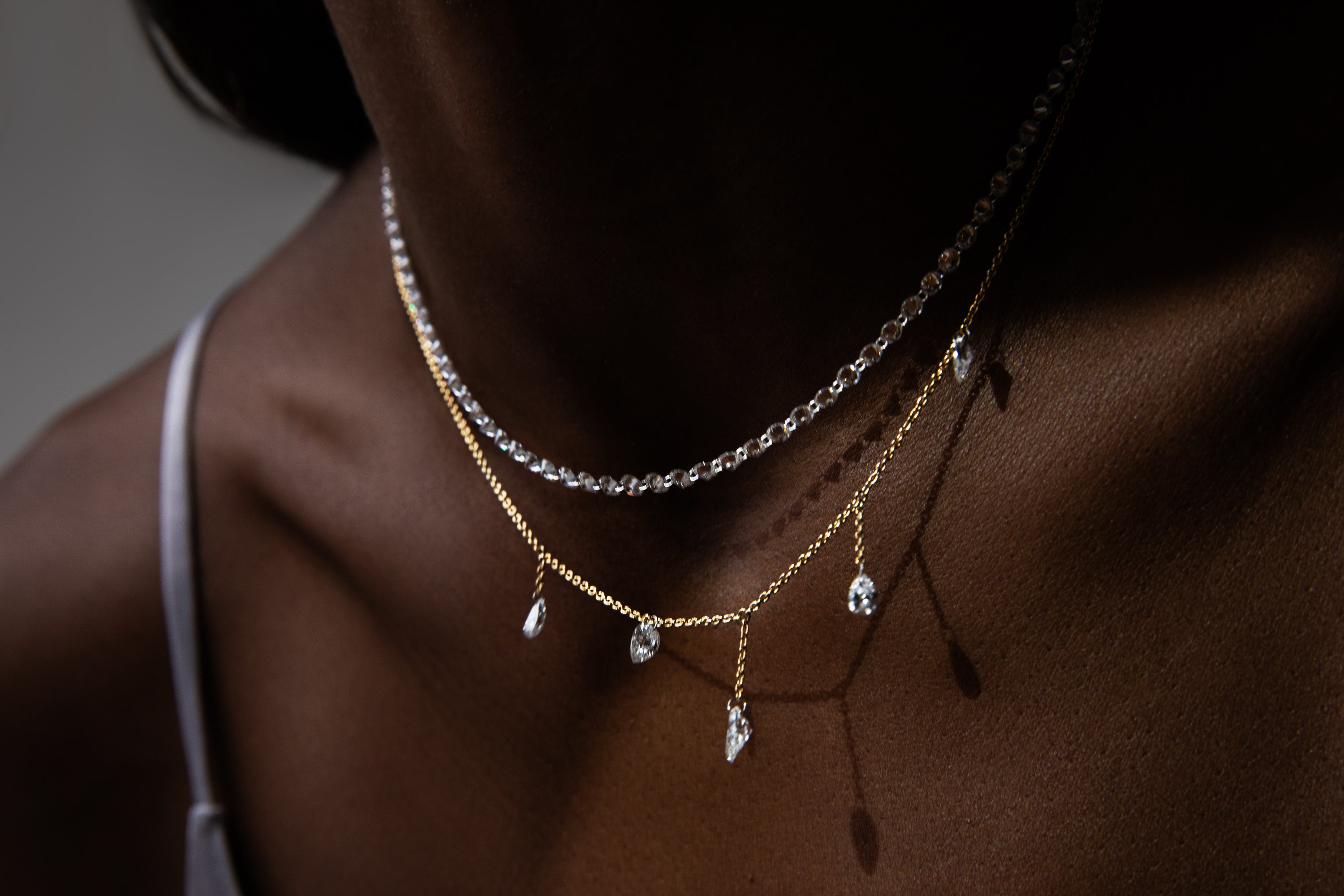 Whether as a dangling charm, a floating necklace, or bracelet that shines with your movement, we love to pierce diamonds. This floating setting allows light to shine through a diamond, enhancing its brilliance.