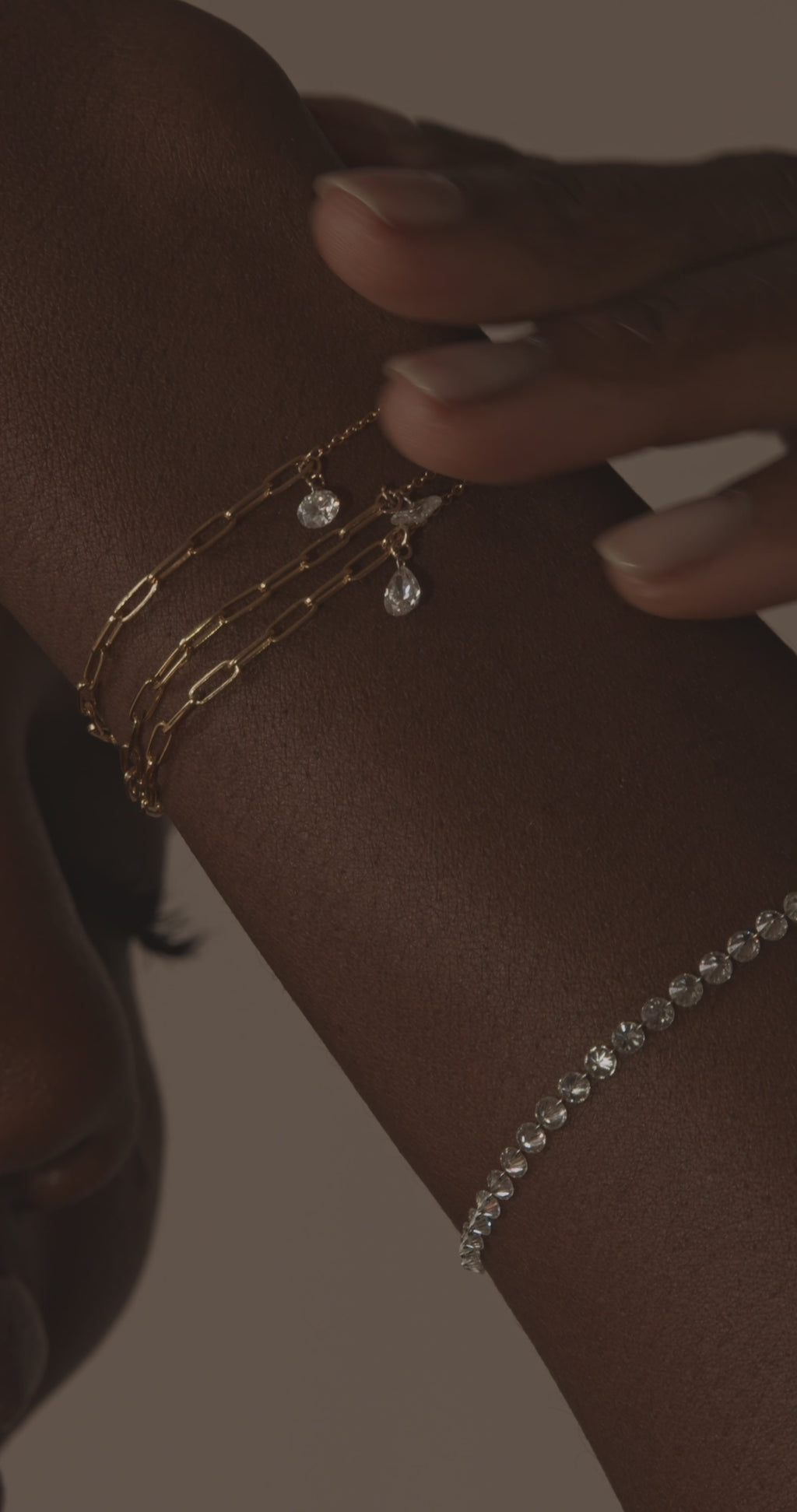 A small round lab-grown diamond is laser-drilled at the drop and attached by a jump ring dangling on a duo chain bracelet of solid 14k gold Italian chain and a delicate paperclip chain. The floating pierced diamond dangles and shimmers with movement.